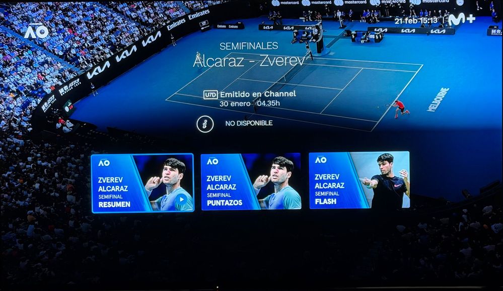 El método más sencillo para reproducir un contenido ya emitido en directo desde Movistar Plus+ es utilizar la opción U7D (Últimos 7 Días). Sin embargo, el partido que tú estás indicando entre Alcaraz - Zverev, semifinales del último Open de Australia, sobrepasa por mucho ese plazo de referencia. Fue emitido el 30 de enero de 2026 y a partir de las 04:35 horas