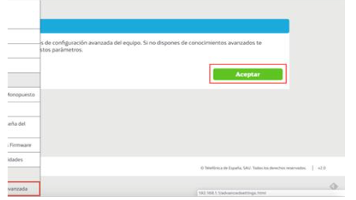 Nos aparecerá un mensaje avisando que estamos accediendo a la configuración avanzada. Pulsamos en Aceptar.