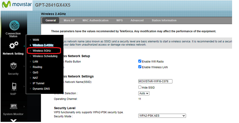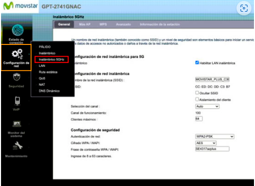- Seleccionamos Configuración de Red > Inalámbrico 5GHz