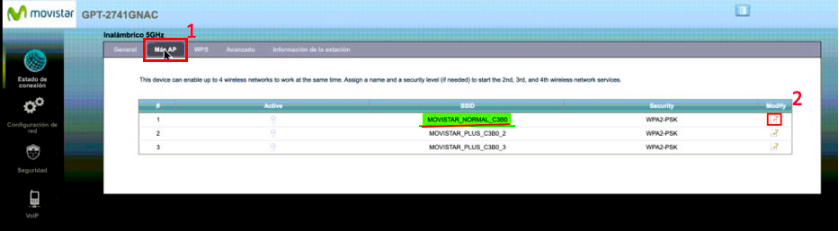 - En el menú de Inalámbrico 5Ghz pulsaremos "Mas AP", y pulsaremos en la opción de "Modificar" (Modify) que corresponda con el nombre de la red que no sea plus (La red de 2,4 Ghz)