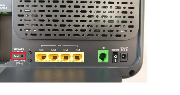 • Con el router encendido, presiona con un objeto punzante el pulsador Reset situado en la parte posterior del HGU durante al menos unos 10 segundos y después suéltalo.