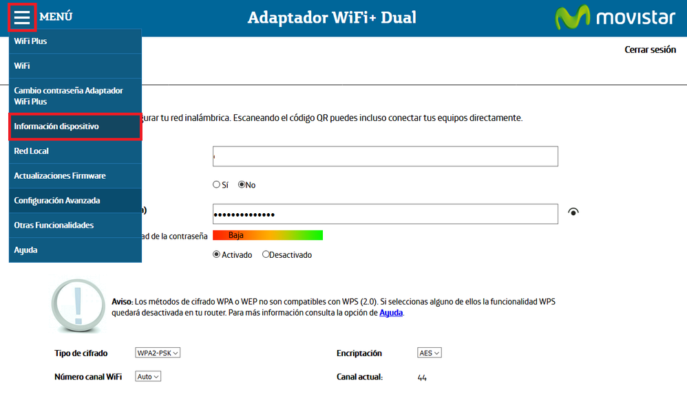 Cuando escribamos correctamente la contraseña y validemos dando a Entrar, nos aparecerá la página de configuración del equipo donde en la parte superior izquierda podemos clicar en el MENÚ desplegable y del menú elegir Información dispositivo