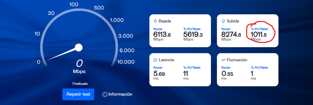 Agradecemos que nos hayas compartido la captura del test de velocidad; al revisarla, podemos confirmar que el router está recibiendo adecuadamente velocidades superiores a 8 Gbps en subida, lo cual indica que la conexión llega de manera correcta al equipo principal. En cuanto a tu PC o tablet, observamos que la velocidad registrada ronda los 1011 Mbps, lo que corresponde al límite habitual de muchos puertos y tarjetas de red tipo Gigabit, por lo que esta diferencia es completamente normal y se relaciona con las capacidades técnicas del dispositivo, el tipo de conexión utilizada o las características del adaptador de red.