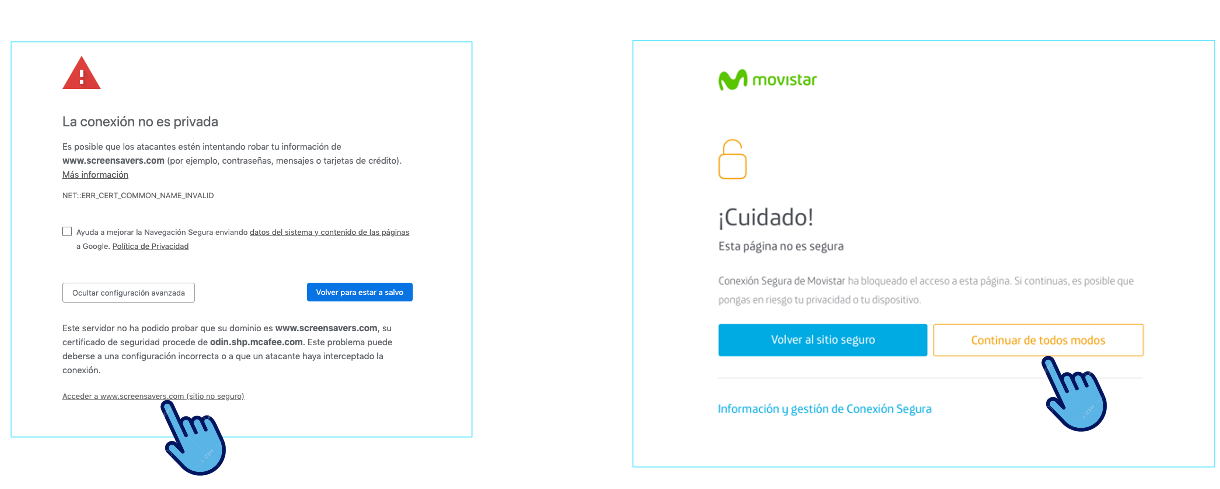 Por lo general cuando tiene que ver el bloqueo con el servicio de Conexión Segura de Movistar, suele aparecer un mensaje de advertencia similar a este: