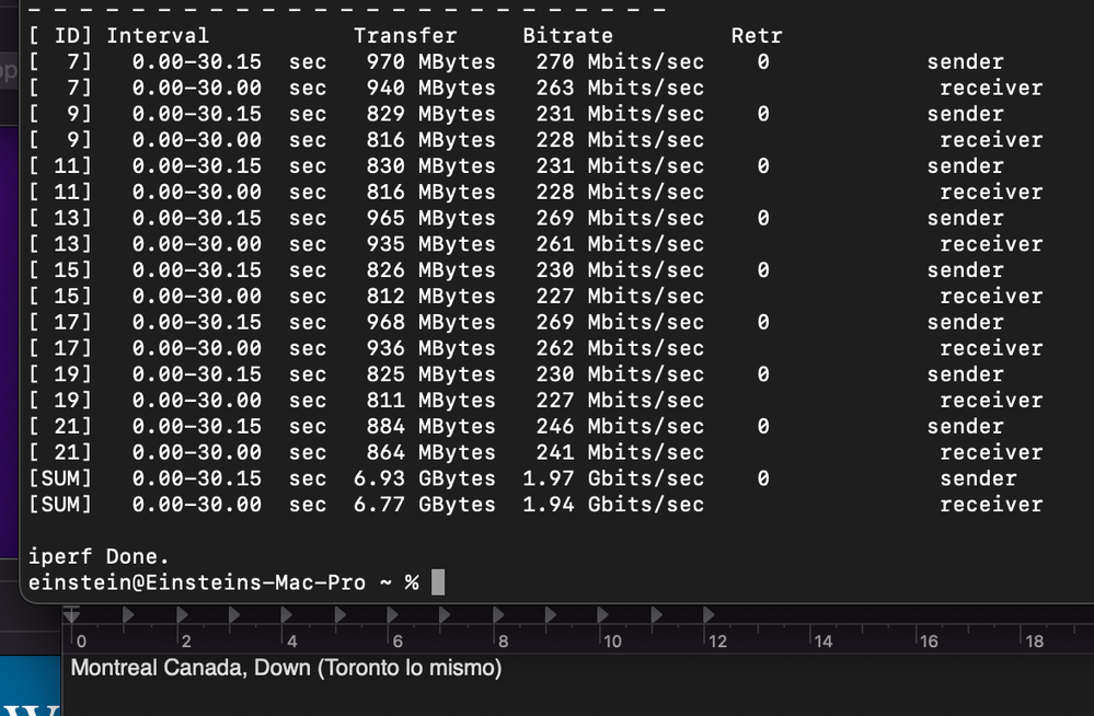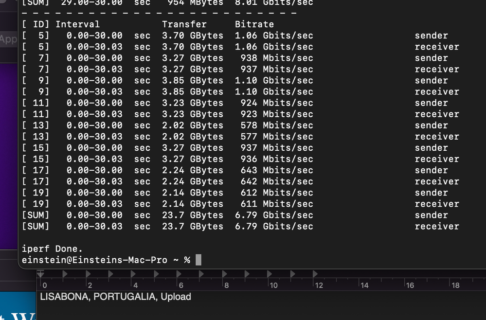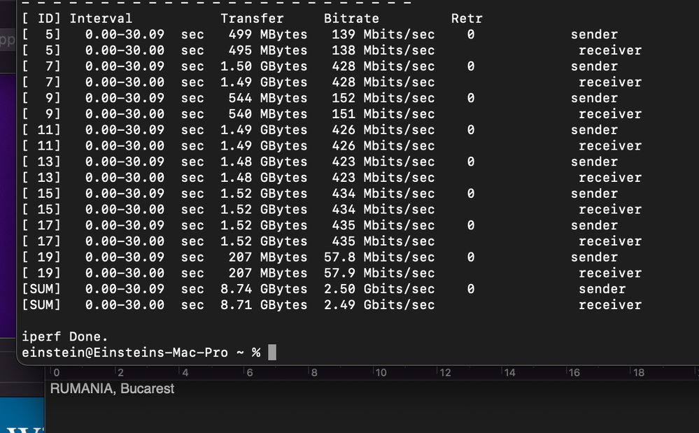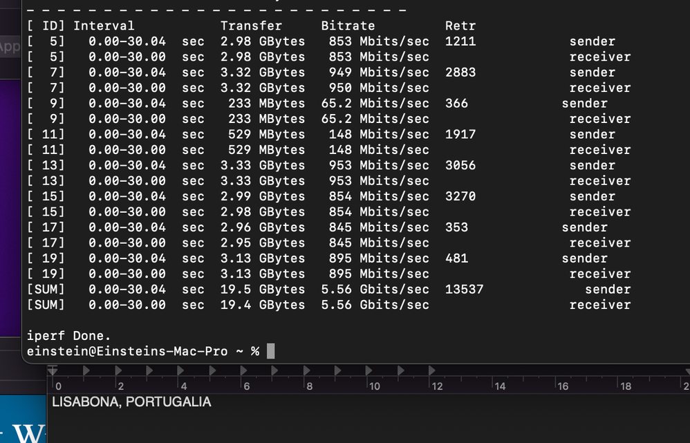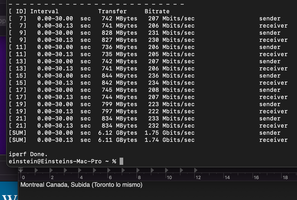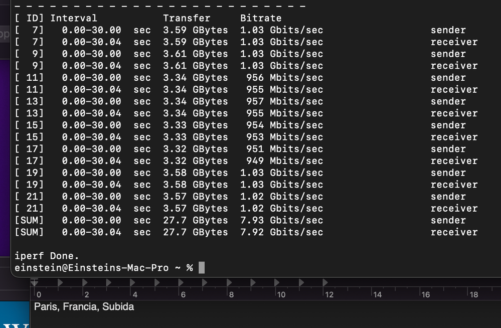 Los mejores resultados de velocidad se obtuvieron usando Iperf3 desde la terminal de macOS. Busqué servidores públicos compatibles con Iperf3 y realicé pruebas con servidores en España, Francia, Rumanía, Reino Unido, Portugal y Canadá. Adjunto las fotos con los resultados.