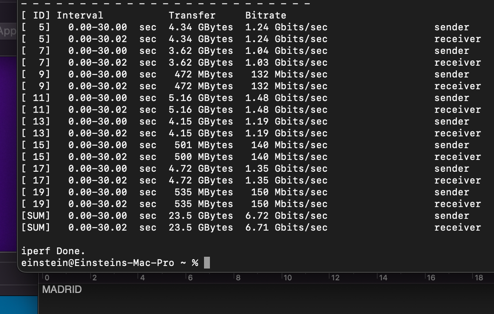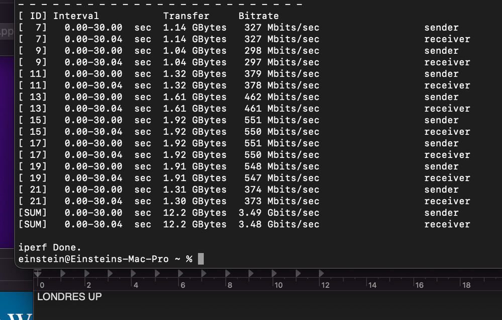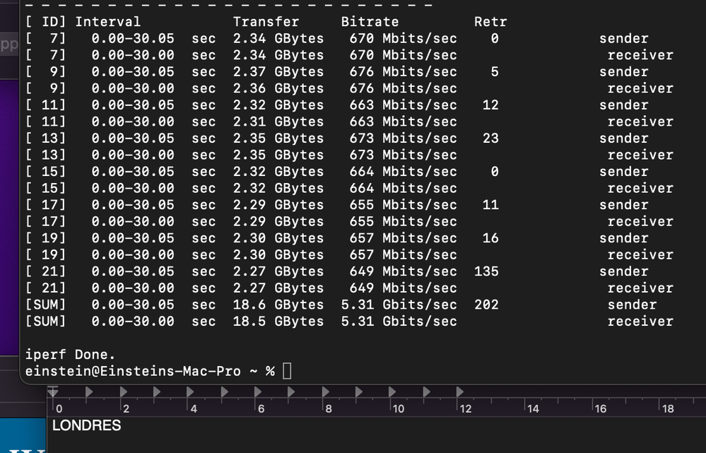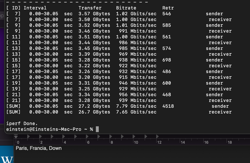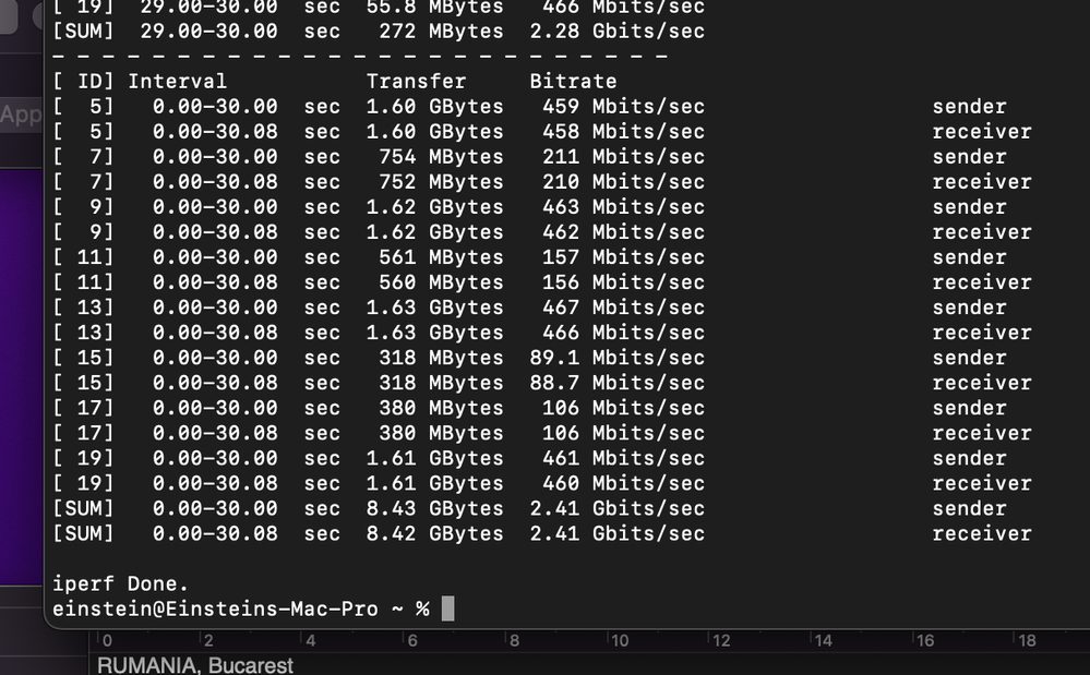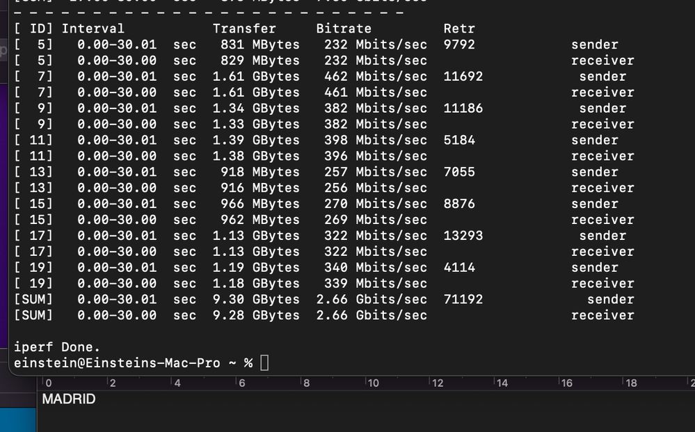 Los mejores resultados de velocidad se obtuvieron usando Iperf3 desde la terminal de macOS. Busqué servidores públicos compatibles con Iperf3 y realicé pruebas con servidores en España, Francia, Rumanía, Reino Unido, Portugal y Canadá. Adjunto las fotos con los resultados.