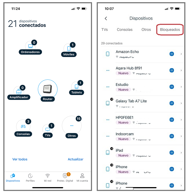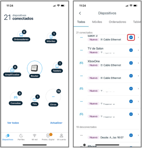 • En el caso de haber puesto un dispositivo en pausa, éste no aparecerá en ningún menú específico. En el Mapa de dispositivos tendremos que ir a Ver todos y buscar el equipo en la lista. Pulsando el símbolo de Play, volveremos a reactivar la conexión del dispositivo.