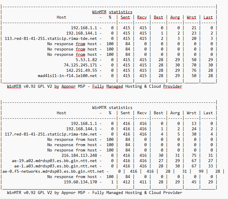 No existe ninguna anomalía en esa traza, los datos son extremadamente buenos!! Mirando a latencia final, tenemos entre 29ms en ambos casos, un dato bastante bastante bueno, y el jitter es prácticamente mínimo teniendo en cuenta la latencia media con respecto a la mínima.