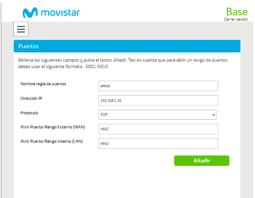 Para guardar esa configuración pulsamos Añadir (se nos añadirá una línea debajo con los puertos abiertos)
