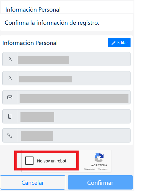 - Luego te aparecerán los datos registrados, tienes que marcar a la casilla “No soy un robot y seguido a esto tendrás que confirmar dichos datos.