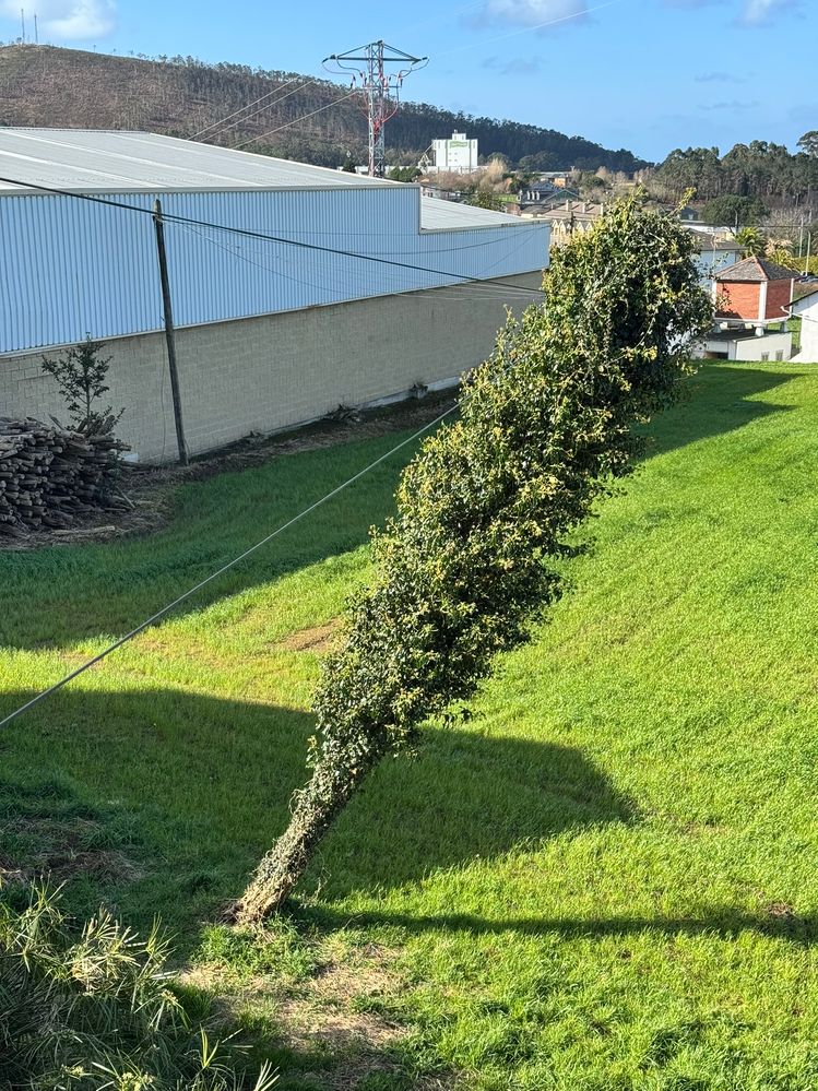 El tema es que el último poste del tendido que lleva a mi casa está a punto de caer, ya lo estaba hace meses pero las sucesivas borrascas de este invierno lo han puesto mucho peor, en este momento se sostiene sólo por la tensión que hacen los cables de la fibra y el antiguo cobre, que aún no han retirado... os dejo un par de fotos del estado actual: