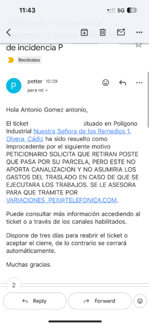 Me gustaria dejar por escrito lo siguiente, llevo meses intentando contactar atraves de peter con vosotros, he realizado diferentes acciones, vino un tecnico me dijo que se pondrian en contacto conmigo, y solo me contestais que yo me he negado a soterrar lo cables, mover el poster y todo es mentira, pueden mirar mis contestaciones por peter, en definitiva vamos a volver a guardar la maquinaria agricola en el terreno ya que lo he comprado para ello, he intentado poner remedio al problema de que haya cables a menos de 1 metro de suelo pero visto que os da igual, a mi tambien me da igual, intentare no causar en caso de que algun tractor se enganche o algun remolque arranque algun cables, espero quesar exento de responsabilidad alguna ya que sois vosotros lo que no quereis buscar solucion a que vuestras infraestructuras esten anticuadas y en mal estado