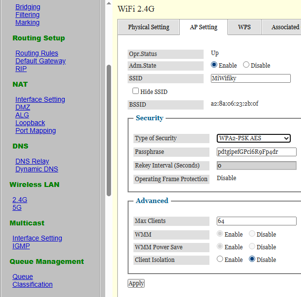 - Type of Security: Por defecto WPA2-PSK AES. Importante no cambiarlo, ya que dejaría de funcionar la red