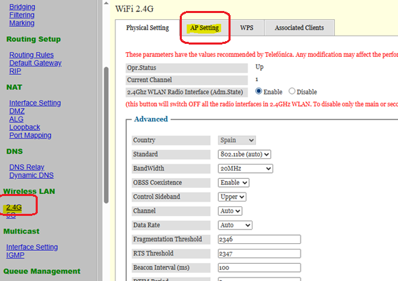 3) En el menú de la parte izquierda, pulsamos en 2.4G. A continuación, de las pestañas de la parte superior, pulsamos AP Setting