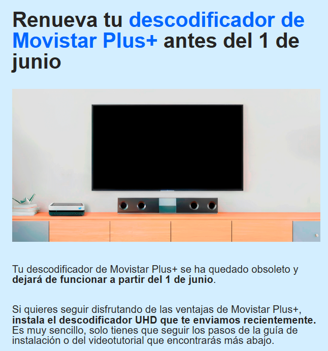 Queremos informarte que este mensaje es una comunicación automática que se está enviando de forma general a todos nuestros clientes. El objetivo es identificar a quienes aún cuentan con decodificadores antiguos y gestionar con antelación el reemplazo del equipo, evitando posibles incidencias por equipos obsoletos que dejarán de funcionar próximamente.