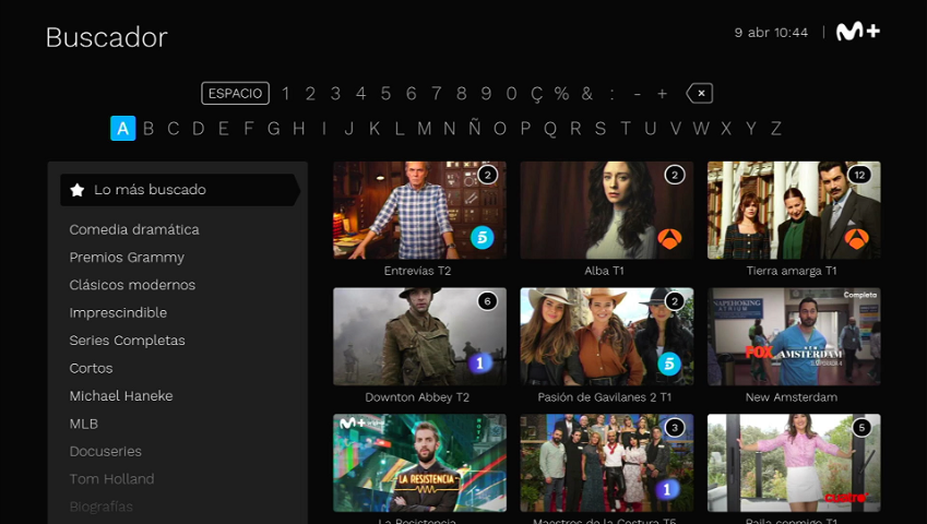 Al acceder al buscador, tenemos un teclado virtual, con el cual escribir el nombre de series, películas, .... que queremos buscar. También nos muestra a la izquierda los términos más buscados: