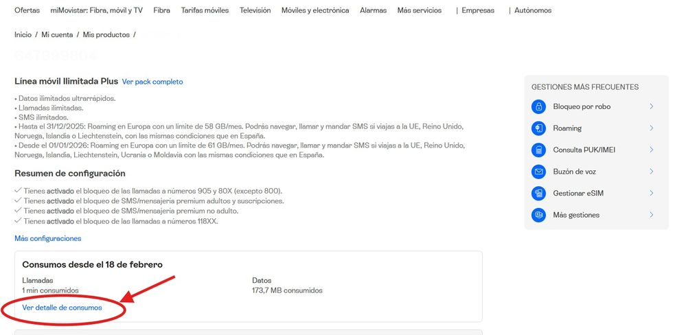 Puedes consultar los consumos del periodo en curso de tus líneas en el Área Cliente Mi Movistar y en la App Mi Movistar, seleccionando la opción "Mis Productos".