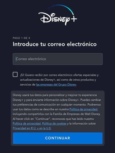 Este BIDI os llevará a una página personalizada de disneyplus.com donde podréis activar vuestra suscripción a Disney+ creando vuestra cuenta de Disney+ asociada a Mi Movistar con el email y contraseña que elijáis.
