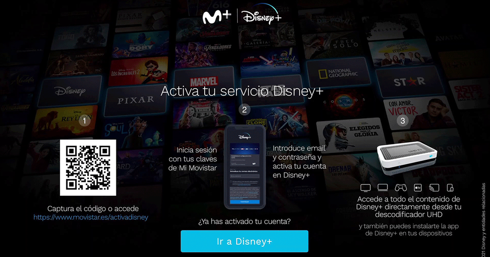 Una vez hayáis creado vuestra cuenta de Disney+, para disfrutar Disney+ tendréis que entrar en Disney+ a través del descodificador UHD Movistar+ o descargaros la app de Disney+ en cualquiera de los dispositivos compatibles: móviles, tablets, decodificadores de TV como Chromecast o Apple TV 4K, Smart TVs y consolas o acceder a www.disneyplus.com desde un navegador web compatible e iniciar sesión con vuestro email y contraseña de Disney+ para disfrutar todo el contenido de Disney+. Podéis consultar el listado completo de dispositivos y plataformas compatibles con Disney+