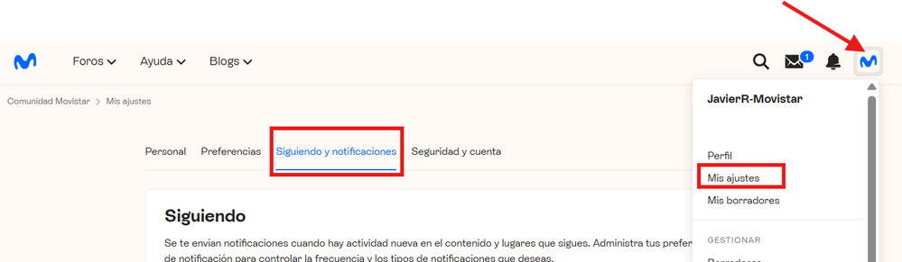 Pinchando en tu usuario, dentro de la sección mis ajustes, puedes configurar los avisos de la Comunidad para activar o desactivar las novedades de los temas en los que participas o estás siguiendo. Los privados que te mandan o cuando un tema se da por solucionado...