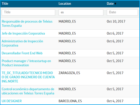 Si estás buscando trabajo, desde la Comunidad te informamos de los nuevos empleos disponibles en Telefónica, en esta ocasión las nuevas ofertas para el mes de noviembre, para ello, accede a la Web de empleo del Grupo Telefónica. En la imagen puedes ver algunos de los empleos anunciados para España disponibles para este mes de noviembre. Dependiendo del filtro de búsqueda que utilices, descubrirás múltiples ofertas también en otros países; además la información se actualiza continuamente, por lo que te recomiendo que permanezcas atento y accedas regularmente a la web de empleo de Telefónica. ¡A qué estás esperando! Infórmate de los nuevos empleos para el mes de noviembre disponibles en la Web de empleo del Grupo Telefónica. Y durante este periodo de tiempo que estás buscando trabajo, puedes optar por inscribirte a alguna de las lanzaderas que Fundación Telefónica y Fundación Santa María La Real ponen a tu disposición para facilitar la inserción laboral de jóvenes que se encuentran desempleados. Dispones de las siguientes modalidades: Formación presencial. Estos son los cursos de formación : - Curso de Big Data - Desarrollo de Aplicaciones Móviles - Programación de vídeojuegos Y muchos más..., accede a formación presencial en Fundación Telefónica y encontrarás cursos muy interesantes. Formación online: Tendrás acceso a cursos online gratuitos. Los más detacados son: Habilidades para el empleo, WordPress, Programación de videojuegos, introducción a la programación, Introducción al Machine Learning, Emprendimiento Social, Gestión de proyectos con metodologías Ágiles, Diseño Web con HTML5 + CSS y Aplicaciones móviles. En todos los casos debes tener entre 18 y 35 años, estar desempleado y tener finalizado 4º de la ESO. ¡Mucha suerte a todos!2,5 milVistas0me gusta0Comentarios¿Buscas trabajo? Descubre la oferta de empleo de Telefónica para octubre de 2017