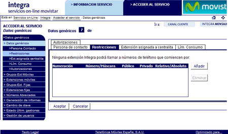 Con Integra puedes puedes evitar que tus líneas llamen a los números que determines, mediante la creación de restricciones y autorizaciones, que definen a dónde pueden y no pueden llamar y enviar mensajes tus líneas. Lo primero que hay que hacer es acceder a Integra. Una vez dentro pulsa en el menú lateral izquierdo, en "Configuración General" y, a continuación, pulsa en la pestaña "Restricciones". Aquí podrás incluir los números prohibidos para tus líneas. Para ello pulsa en el botón de "Añadir". A la hora de añadir una restricción te aparecerá el menú que ves en la imagen inferior donde incluimos el número o máscara que queremos restringir (siempre con el prefijo del país delante) y elegimos si aplica a: - Número o Máscara: es una línea en concreto o todos los números que empiezan con esos números - Privado o Público: es una extensión de tu empresa o un número público (el normal de 9 dígitos). - Relativo o Absoluto: elige si la restricción va a poder tener excepciones (Relativo) o no. Una vez añadida la restricción aparecerá en el listado de las que tengamos incluidas. Pulsamos el botón de "Aceptar" y se aplicará la restricción a nuestras líneas. A estas restricciones se les puede crear excepciones. En la opción de "Autorizaciones" podremos añadirlas configurandose igual que las restricciones. Gracias a este servicio de Autorizaciones y Restricciones evitarás cualquier posible mal uso de tus líneas y gastos innecesarios. Si lo que ocurre es que quieres impedir que determinadas líneas te llamen a ti, en el post: Cómo impedir que un número te pueda llamar a tus líneas de Integra. Te explicamos como hacerlo. Si para acceder a Integra has tenido algún problema, en el post: Cómo acceder a Integra. Te explicamos todo lo que necesitas saber para acceder sin problema. Te contamos como acceder sin incidencias.2,4 milVistas0me gusta0ComentariosCrea usuarios secundarios con perfiles distintos para acceder a Mi Movistar