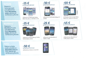 Buenos días a tod@s Desde Movistar queremos ayudarte a renovar tu movil, por eso ahora y hasta el 31 de Marzo, seas del operador que seas, de contrato o de tarjeta, ven a nuestras tiendas Movistar con tu Nokia usado y te damos adicionalmente a su valoración habitual con Renueva y Recicla, 50 euros de descuento adicional para la compra de un nuevo terminal Nokia Lumia 820. Si lo que tienes es un teléfono Samsung usado, y sobre su valoración habitual en Renueva y recicla, si te llevas uno de estos terminales de la familia Samsung Galaxy, obtienes los siguientes descuentos adicionales: 15€ extra por la compra de: Galaxy Mini, Ace, Ace 2, GSIII y GSIII Mini. 30€ extra por la compra de:Galaxy SII, Note. 60€ extra por la compra de: Galaxy Note II, 10.1 y Camera. Por ultimo para los que tengáis una Blackberry usada, si os lleváis uno de estos terminales de RIM, obteneis los siguientes descuentos adicionales: 15€ extra por la compra de: Blackberry 8520, 9220, 9300 0 9320. 25€ extra por la compra de:Blackberry 9360 o 9380. 45€ extra por la compra de: Blackberry 9790, 9810 o 9860. Recordaros que esta promoción valida para nuevas altas en contrato, portabilidades a contrato, migraciones de prepago a contrato y canjes del Programa de Puntos, así como nuevas altas en prepago con terminal. Aplica también a operaciones con contrato Movistar Fusión. Mas información en este enlace. Un saludo.14 milVistas0me gusta0Comentarios