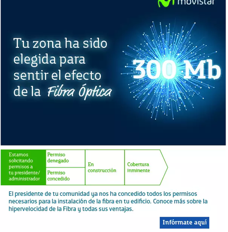 Buenas tardes. Necesito información acerca de la instalación de fibra en mi urbanización. TODA la calle donde vivo tiene instalada fibra óptica, excepto mi urbanización (al parecer cuando era de la constructora hubo un problema con los permisos pero ahora ya todos somos propietarios y queremos Movistar). Desde finales de 2018 estamos solicitando por diferentes medios (1004, tiendas físicas, redes sociales, web, formularios para solicitar fibra a través del presidente de la comunidad, etc.) que nos instalen fibra óptica. Tenemos fibra con el resto de compañías telefónicas, pero queremos Movistar. ¿Qué más podemos hacer? La situación está paralizada en la fase solicitud de permisos y no se ha movido de esa fase. Necesitamos que alguien de movistar indague el porqué de nuestra situación porque si no nunca tendremos movistar, ya que repito, en todas las urbanizaciones de mi calle tienen fibra con movistar. Además en el cuarto de telecomunicaciones, cuando han venido diferentes técnicos de movistar, nos han comentado que hay unos cables en el suelo sin instalar que seguramente son de cuando movistar vino a instalar la fibra hace años y se le denegaron los permisos por parte de la constructora. Por favor, ahora todos los vecinos somos propietarios y queremos Movistar. ¿Alguien nos podría ayudar?1,1 milVistas0me gusta3ComentariosDespliegue de fibra en fase de permisos