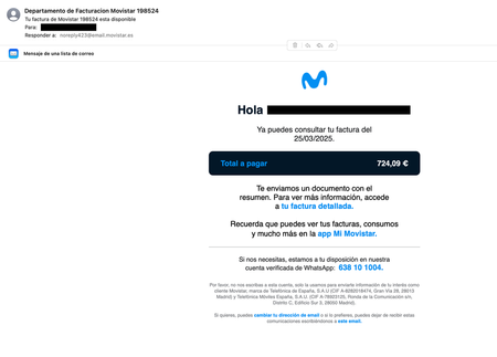 Campaña de Phishing contra Movistar con avisos de factura elevada