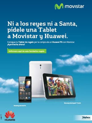 ¡Saludos amig@s! :smileyvery-happy::smileyvery-happy: La Navidad está a la vuelta de la esquina y para celebrarlo desde Movistar tenemos preparada una oferta fantástica: Llévate un Huawei Ascend P6 y de regalo una Tablet Mediapad 7” Youth para los primeros 1.500 afortunados. Si lo que tú necesitas es un ebook, échale un vistazo a nuestra otra oferta navideña... :smileywink: ¿Qué tenéis que hacer para conseguir vuestro regalo? Muy fácil: dirígete a cualquier punto de venta Movistar desde el 1 de Diciembre de 2013 hasta el 8 de Enero de 2014, adquiere tu nuevo Huawei Ascend P6 (consulta la ficha de producto) y si eres uno de los primeros 1.500 clientes, obtendrás un código que podrás canjear por una Tablet Huawei Mediapad 7" valorada en 149€. Además os recordamos que con nuestro servicio Renueva y Recicla durante el mes de diciembre por la entrega de un terminal usado, obtendréis un descuento mínimo de 20€ para la compra vuestro nuevo Huawei Ascend P6. Ambas ofertas pueden ser combinadas. :smileyhappy: La promoción es válida para los primeros 1.500 clientes en cualquier operación comercial vinculada a la adquisición de un terminal Huawei Ascend P6. Aplicable a nuevas altas contrato, portabilidades a contrato, migraciones de tarjeta a contrato y canjes con cualquier contrato móvil , altas en tarjeta así como altas o renovaciones en cualquier modalidad de Movistar Fusión (tanto línea principal como adicionales). Para cualquier duda, podéis consultar aquí las Bases de la promoción. En caso incidencias podéis dirigiros al correo electrónico de atención al cliente comunicacion@hoyesnavidadhuawei.com o en el teléfono : 902 879 737 ¡Daos prisa, que van a volar! ¡Saludos! :smileywink::smileywink:20 milVistas0me gusta2ComentariosLos amig@s de las tablets